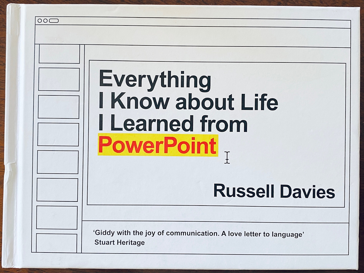I bought this book because I was intrigued by the title and shape in the aspect ratio of a slide. Russell Davies recounts his career in advertising and UK government, and what he has learned "from thirty years of PowerPoint and how to communicate, be creative and not get too scared". He notes the principles in this book equally apply to other presentation software - Google Slides, Apple Keynote and Libre Office.